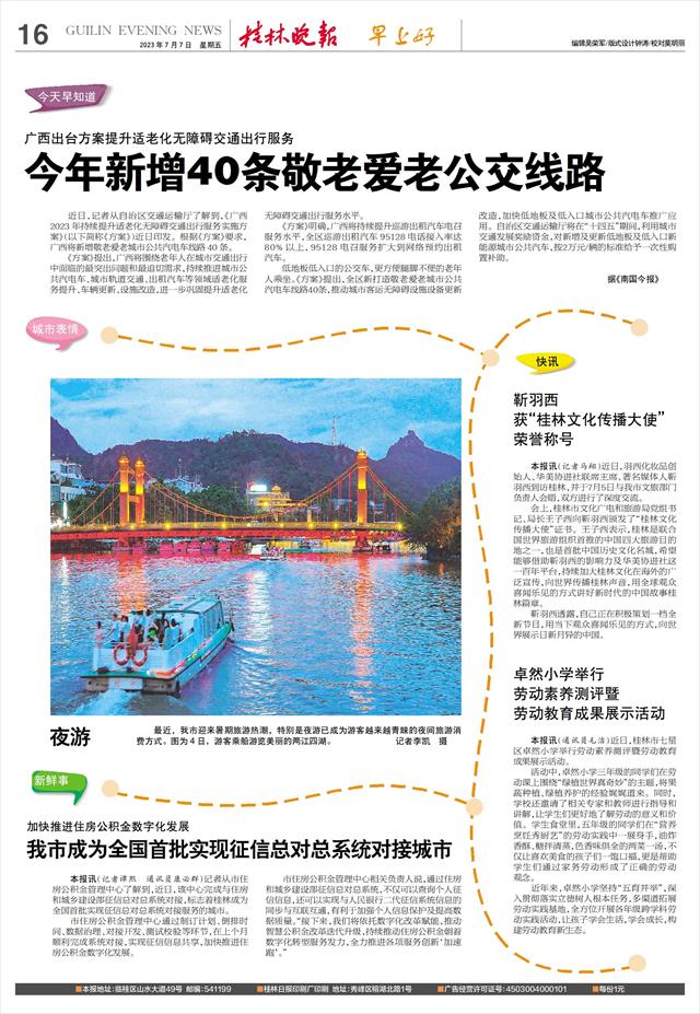 广西出台方案提升适老化无障碍交通出行服务 今年新增40条敬老爱老公交线路   近日,记者从自治区交通运输厅了解到,《广西2023年持续提升适老化无障碍交通出行服务实施方案》(以下简称《方案》)近日印发。根据《方案》要求,广西将新增敬老爱老城市公共汽电车线路40条。