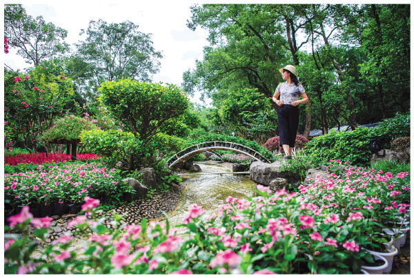 近日,游客在七星景区打卡拍照。暑假期间,景区在“乐水瀑布”处放置了许多鲜花,为游客展现出一个优美的山水花境。 记者滕嘉 摄