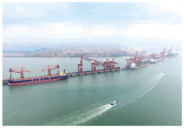 7月10日,多艘轮船靠泊在唐山港曹妃甸港区矿石码头卸载(无人机照片)。新华社发
