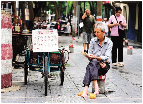 近日,四会路旁一回收废旧的老者坐在路边的石凳上,气定神闲地看着一本泛黄的老书,旁边人来人往的嘈杂,也没打扰他读书的乐趣。记者李凯 摄
