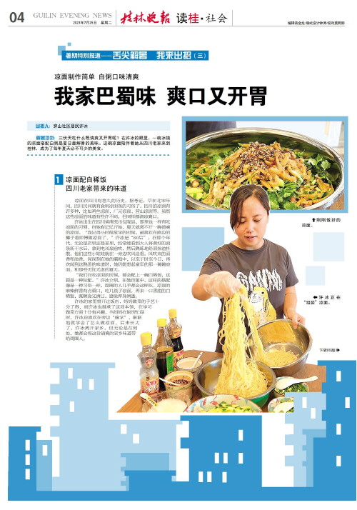 看到自己做的凉面还有川菜得到大家的喜爱和称赞,许冰感到特别有成就感。许冰说,来桂林这么多年,自己的四川胃始终没有变,母亲也会从老家给她寄川味腊肠等等,她很乐意把这些家乡美食分享给周围的人。更让她高兴的是,她的孩子也特别喜欢吃凉面。每年夏天一开始,儿子都会对她说:“妈妈,天气热了,可以做凉面了。”看着儿子一碗接一碗地吃着面,喝着白稀饭,许冰仿佛看到了自己的童年。她说,这碗凉面除了是她念念不忘的家乡味道,将来也会成为孩子心中难忘的夏天回忆。