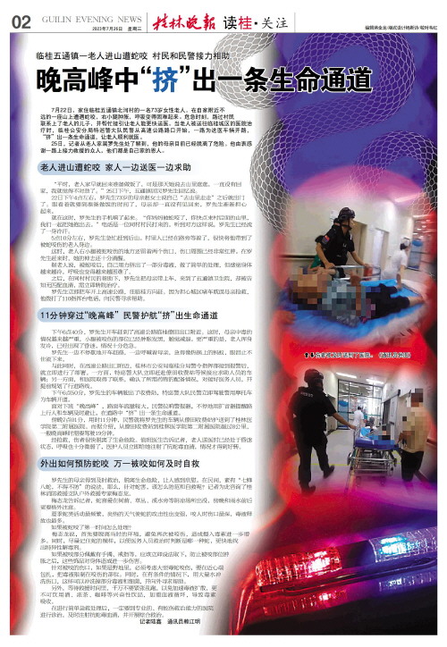 临桂五通镇一老人进山遭蛇咬 村民和民警接力相助 晚高峰中“挤”出一条生命通道   7月22日,家住临桂五通镇北河村的一名73岁女性老人,在自家附近不远的一座山上遭遇蛇咬,右小腿肿胀,呼吸变得困难起来。危急时刻,路过村民联系上了老人的儿子,并帮忙接引让老人能更快送医。当老人被送往临桂城区的医院治疗时,临桂公安分局特巡警大队民警从高速公路路口开始,一路为送医车辆开路,“挤”出一条生命通道,让老人顺利就医。