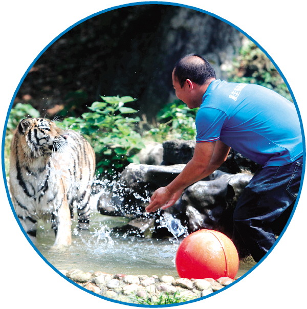 猛兽区里的游客是最多的。东北虎“妞妞”享受完早餐后,饲养员就和它互动嬉戏了起来。“因为天气太热,所以最近的玩耍项目都以戏水为主。”饲养员说,与“妞妞”互动是最受游客欢迎的环节,所以每天可以让它玩水玩久一些,这样既兼顾了娱乐,还可以享受清凉。