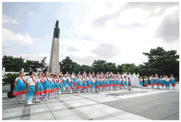 7月27日,来自中国少年先锋队沈阳雷锋朗诵团的孩子们在纪念碑前朗诵《谁是最可爱的人》(节选)。