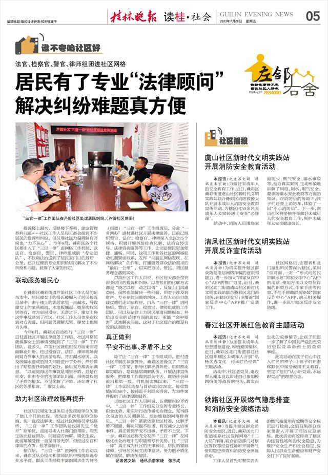投诉楼上漏水、反映楼下养鸡、建议管理养狗问题……社区工作人员每天都会接到不少居民的投诉和纠纷,但仅靠社区力量调解有时候也“力不从心”。今年6月,叠彩区各个社区都引入了“三官一律”进网格工作机制,以法官、检察官、警官、律师组成的“专业团队”,不仅将法治送到了居民家门口的最后一公里,还以过硬的专业知识给居民解决了不少纠纷和问题,获得了大家的肯定。