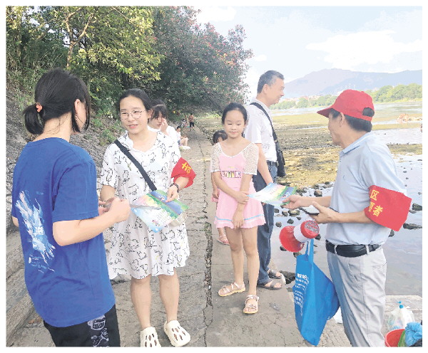 “双报到”党员和志愿者正在江边向居民宣传防溺水。