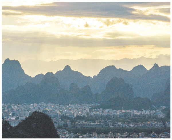 5日傍晚,市区上空出现了云隙光,夕阳的光线透过云层散射到山峰上,画面如诗如画。记者滕嘉 摄