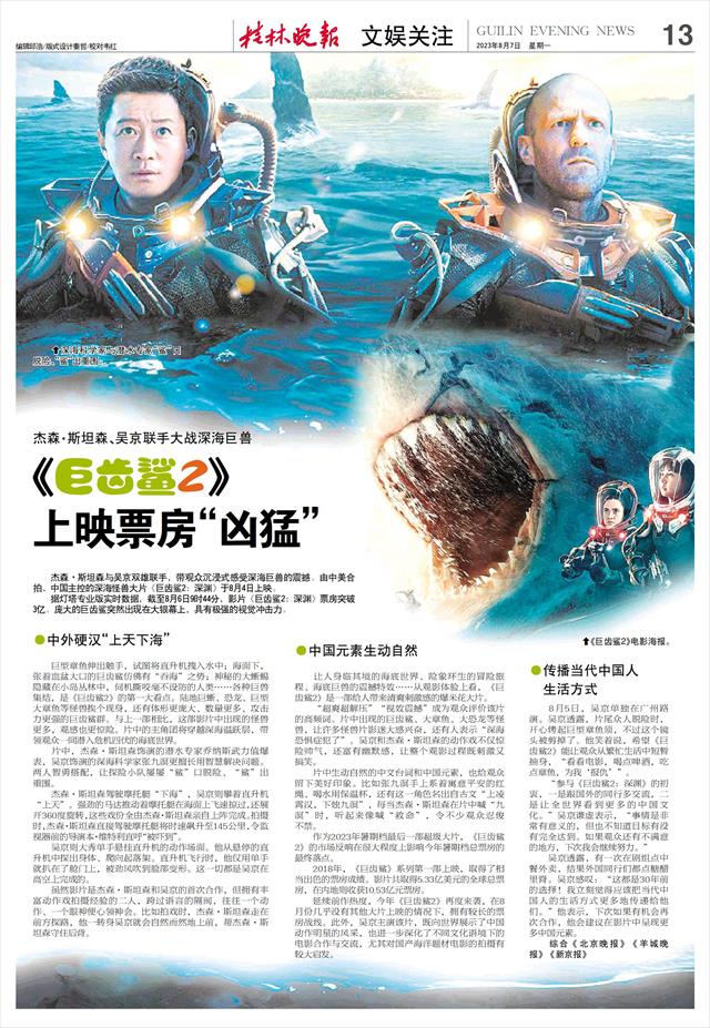 上映票房“凶猛”   杰森·斯坦森与吴京双雄联手,带观众沉浸式感受深海巨兽的震撼。由中美合拍、中国主控的深海怪兽大片《巨齿鲨2:深渊》于8月4日上映。