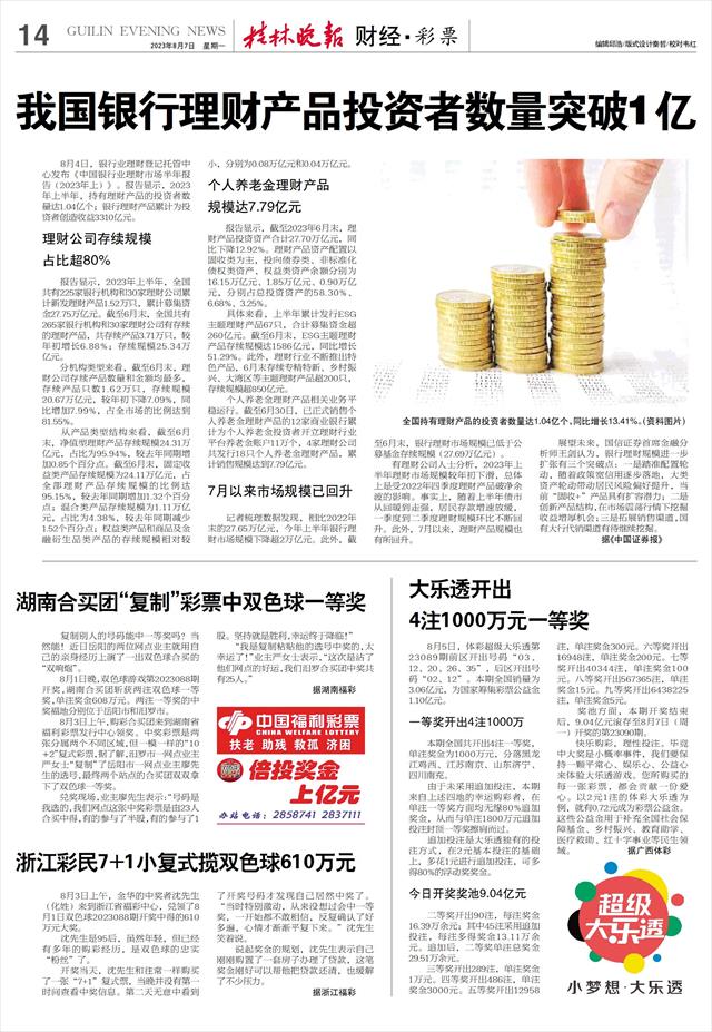 我国银行理财产品投资者数量突破1亿   8月4日,银行业理财登记托管中心发布《中国银行业理财市场半年报告(2023年上)》。报告显示,2023年上半年,持有理财产品的投资者数量达1.04亿个;银行理财产品累计为投资者创造收益3310亿元。