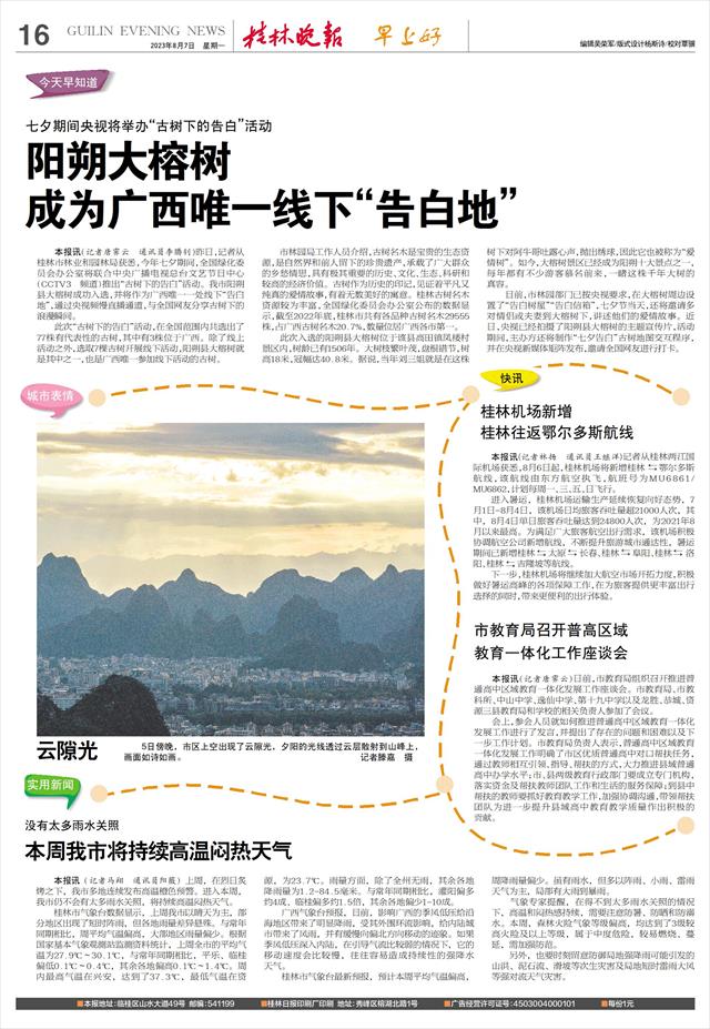 成为广西唯一线下“告白地”   本报讯(记者唐霁云 通讯员李腾钊)昨日,记者从桂林市林业和园林局获悉,今年七夕期间,全国绿化委员会办公室将联合中央广播电视总台文艺节目中心(CCTV3 频道)推出“古树下的告白”活动。我市阳朔县大榕树成功入选,并将作为广西唯一一处线下“告白地”,通过央视频慢直播通道,与全国网友分享古树下的浪漫瞬间。