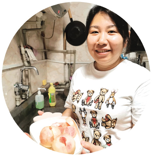 ↑梁玉君将水蜜桃削去皮。