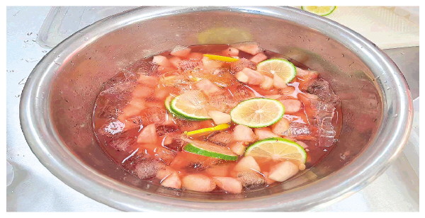 蜜桃柠檬茶等待装入杯中。 记者韦彦青 摄