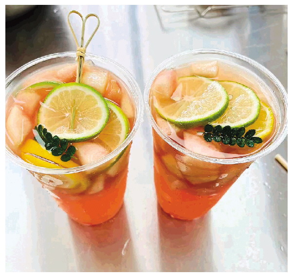 “蜜桃柠檬茶的果肉只是点缀,重要的是汁水,如果不加入茶包,汁水会非常干涩,口感差。”梁玉君说。红心火龙果汁是用来调色的,不需要太多。