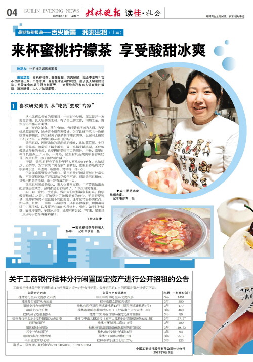 梁玉君说,现在是水蜜桃正当季,它有生津、润肠、活血、消积的功效,含碳水化合物、蛋白质、脂肪、维生素及微量元素等。不管是对老人还是小孩,都有好处。水蜜桃的热量低,也是减脂的好食材。可以说水蜜桃非常适合一家人食用。梁玉君最喜欢做的解暑饮品就是蜜桃柠檬茶。