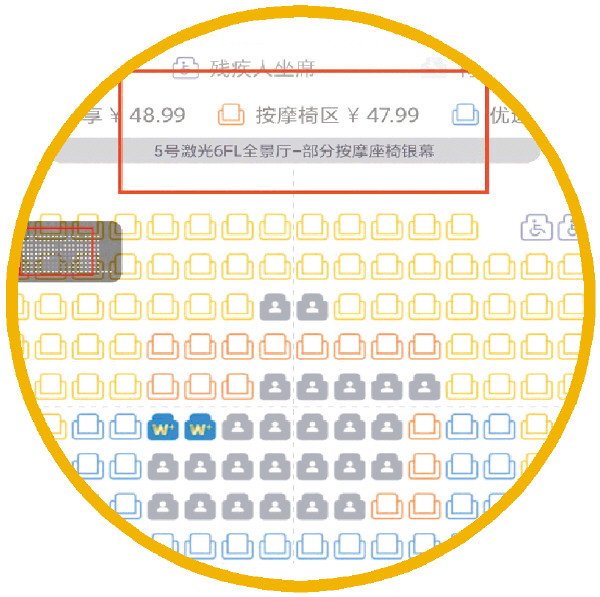 “万达电影”APP里,有明确标明按摩椅的区域。(手机截图)