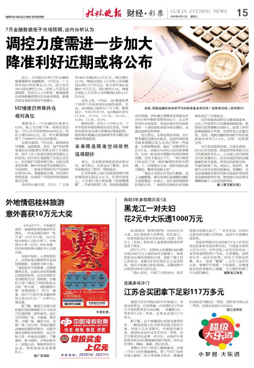 降准利好近期或将公布   近日,人民银行公布7月社会融资规模数据和金融数据。7月份末,广义货币(M2)同比增长10.7%,狭义货币(M1)同比增长2.3%,延续上月双双回落趋势。有业内人士分析称,随着稳增长政策措施效果在年内逐步释放,新增贷款有望保持适度平稳增长。