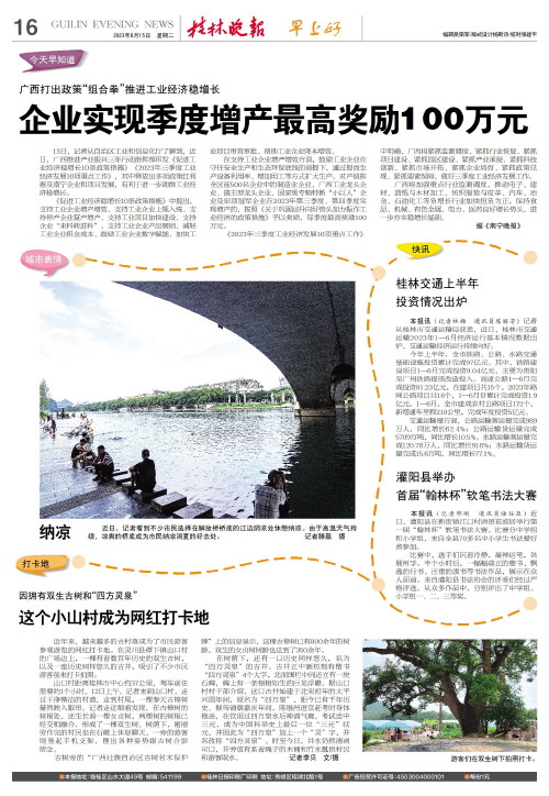 广西打出政策“组合拳”推进工业经济稳增长 企业实现季度增产最高奖励100万元   13日,记者从自治区工业和信息化厅了解到,近日,广西推进产业振兴三年行动指挥部印发《促进工业经济稳增长10条政策措施》《2023年三季度工业经济发展10项重点工作》,其中释放出多项政策红利惠及南宁企业和项目发展,有利于进一步助推工业经济稳增长。