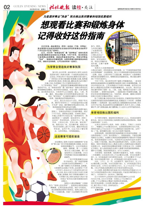 近日,2023年“体育宣传周”暨“迎学青会”桂林市系列全民健身赛事活动在我市拉开帷幕,今年下半年,我市将举办10多项群众体育赛事,搭建全民健身活动平台,积极为学青会“热身”,营造良好的赛事氛围。如果有想看比赛和锻炼身体的市民,请收好这份指南,它可以给你带来一些指引。