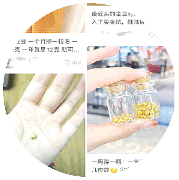 “每个月买几百元的‘金豆豆’存起来,只要金价涨,我就算赚钱。”“攒钱不如攒金,买‘金豆豆’=理财。”社交平台上,年轻人掀起攒金风,搜索相关帖子便有许多分享、心得。有网帖专门介绍哪种方式买黄金最合适,其中提到除了买黄金板料和投资金条外,强烈推荐买“金豆豆”、“金瓜子”。