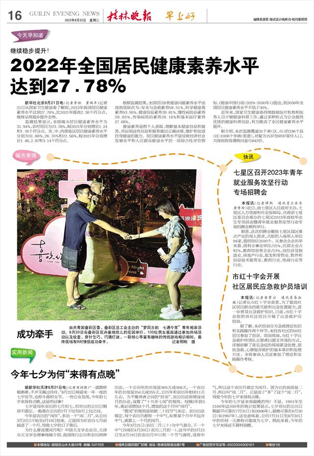 达到27.78%   新华社北京8月21日电(记者李恒 董瑞丰)记者21日从国家卫生健康委了解到,2022年我国居民健康素养水平达到27.78%,比2021年提高2.38个百分点,继续呈现稳步提升态势。