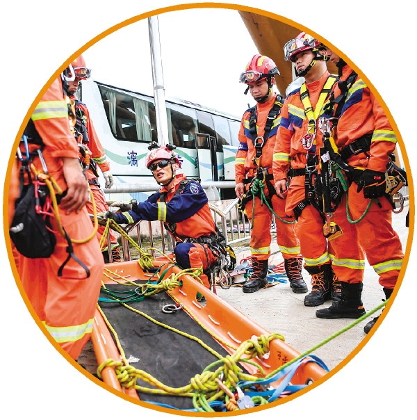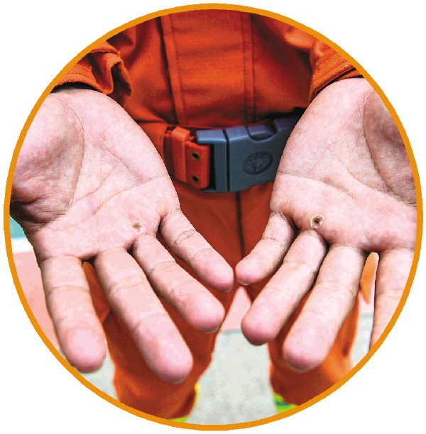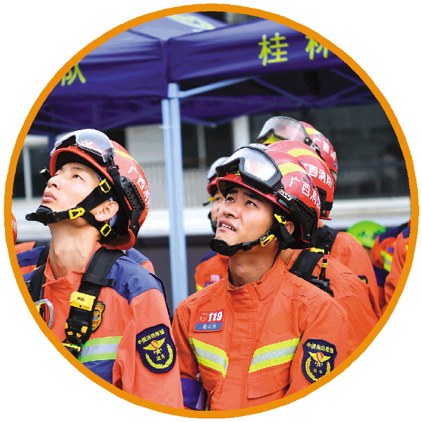 ←经常和绳索打交道,一位消防员的手掌磨出了茧。