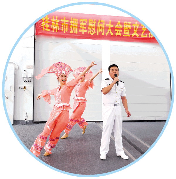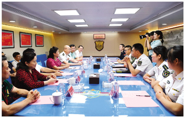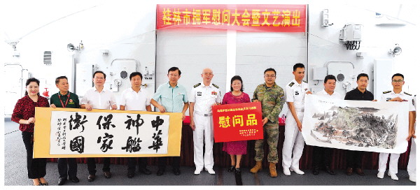 桂林电子科技大学党委书记唐平秋(左五)代表学校向桂林舰赠送书法作品。