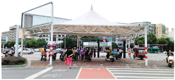 遮阳避雨棚基本覆盖了非机动车和行人等候区的区域。