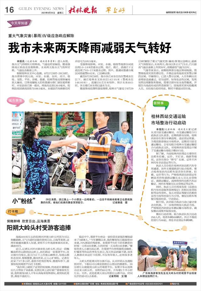随着降雨范围和强度南移,桂林市气象局于8月29日9时解除了重大气象灾害(暴雨)Ⅳ级应急响应。最新天气预报显示,未来两天,我市以多云天气为主,白天最高气温会逐渐上升到30℃,夜晚最低气温为23℃。