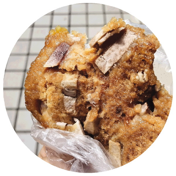 松糕在农村宴席一直都是常客,即使我现在住到市区以后也常常惦记。“屈伯娘松糕”在乐群市场开了很多年,我经常会来买上一块。松糕上面满是甜甜的糖霜,中间部分是更加软糯的咸味糕体,里面还有荔浦芋头,中和之下完全不腻人。这家松糕的味道,跟我记忆中老家宴席上的一模一样。