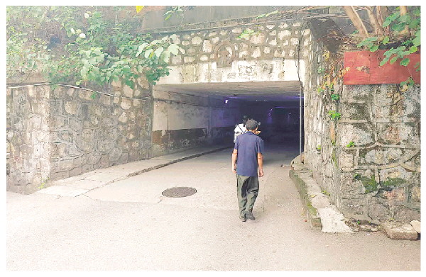 老桂林北站附近的铁路涵洞口,洞口上还有铁路标志。