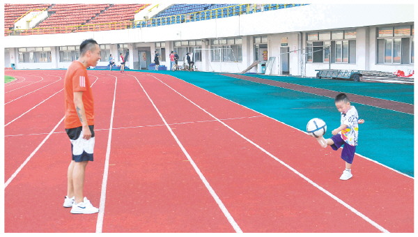 近日在桂林市体育中心足球场,一个孩子正和大人踢足球,孩子踢得很卖力,不一会就满头大汗,俨然是一名足球小运动员。