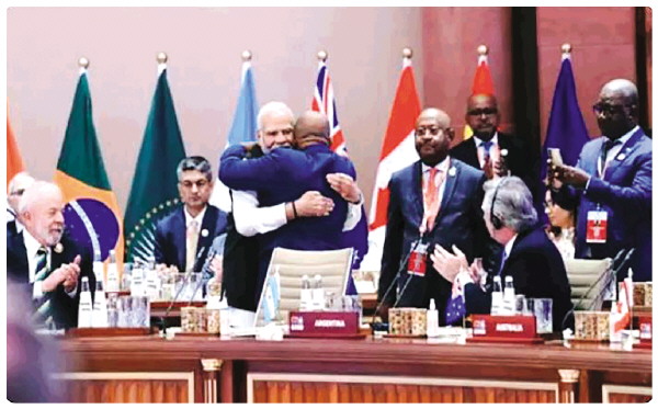 “我邀请非洲联盟的代表作为G20的正式成员就座。”宣布非盟正式加入G20后,印度总理莫迪与非盟轮值主席、科摩罗总统阿扎利握手,并热情拥抱他,邀请阿扎利入座。