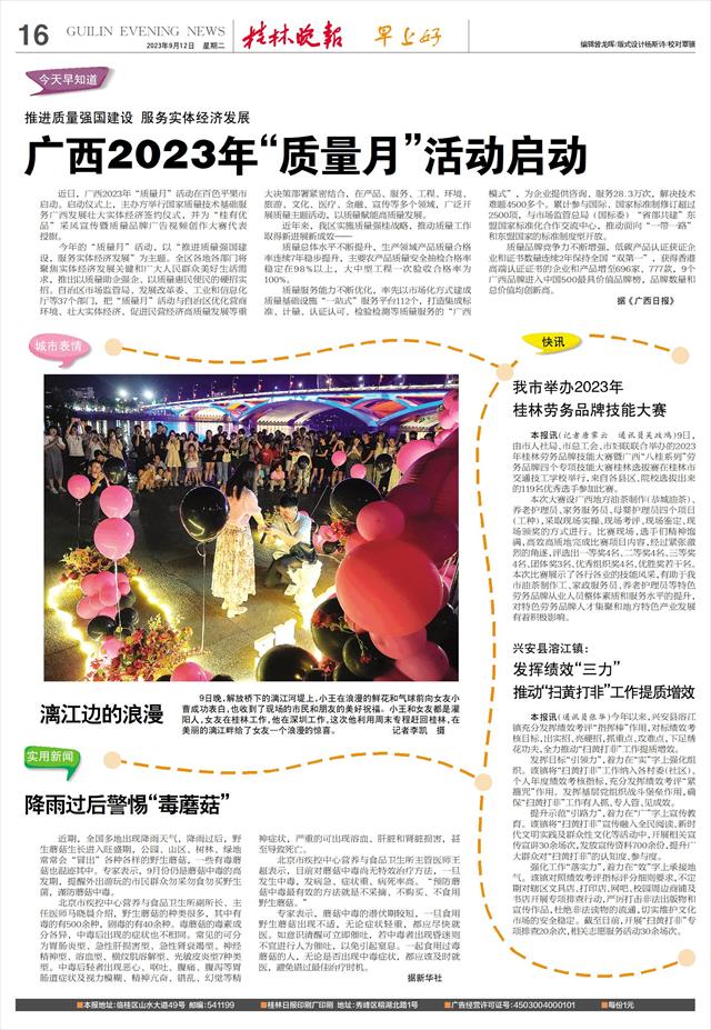推进质量强国建设 服务实体经济发展 广西2023年“质量月”活动启动   近日,广西2023年“质量月”活动在百色平果市启动。启动仪式上,主办方举行国家质量技术基础服务广西发展壮大实体经济签约仪式,并为“桂有优品”采风宣传暨质量品牌广告视频创作大赛代表授旗。