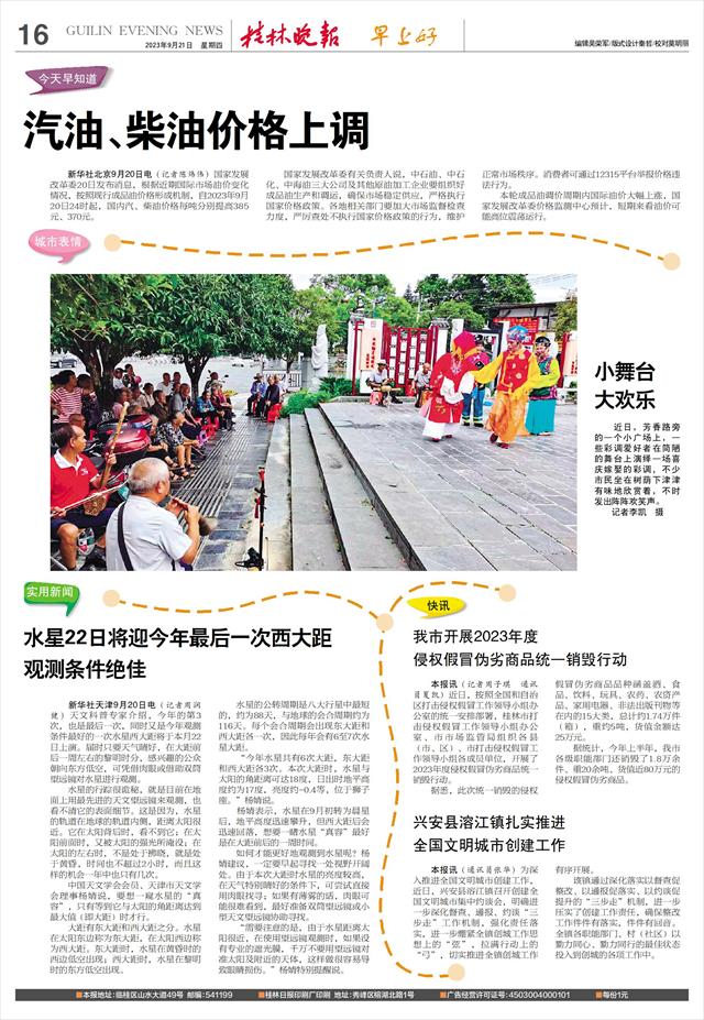 汽油、柴油价格上调   新华社北京9月20日电(记者陈炜伟)国家发展改革委20日发布消息,根据近期国际市场油价变化情况,按照现行成品油价格形成机制,自2023年9月20日24时起,国内汽、柴油价格每吨分别提高385元、370元。