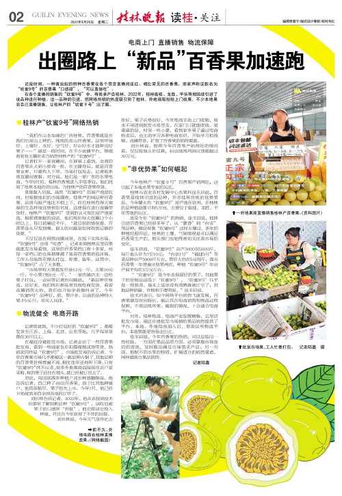 电商上门 直播销售 物流保障 出圈路上 “新品”百香果加速跑   近段时间,一种黄灿灿的特种百香果在各个带货直播间走红。相比常见的百香果,商家声称这款名为“钦蜜9号”的百香果“口感甜”,“可以直接吃”。
