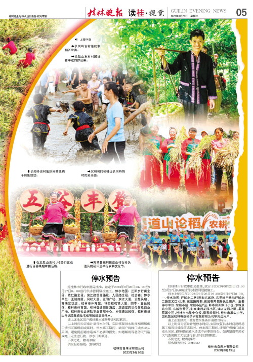 23日,阳朔县福利镇道山村在村头连片的稻田里举行以“一个村庄、一个梦想——村里有戏”为主题的第三届“道山论稻”农耕文化节。节庆“搭台”,农民“唱戏”。在美丽乡村间,在金灿灿的稻田里,村民们舞起长龙,载歌载舞,欢庆又一年的丰收季。农耕文化节期间,道山村设有“村里有圩”、“村里有画”、“村里有影”、“村里有玩”、“村里有吃”等打卡体验点,吸引了众多游客慕名而来,游客们一起体验抓鱼、抓鸭,采买土货,沉浸式体验丰收的喜悦。