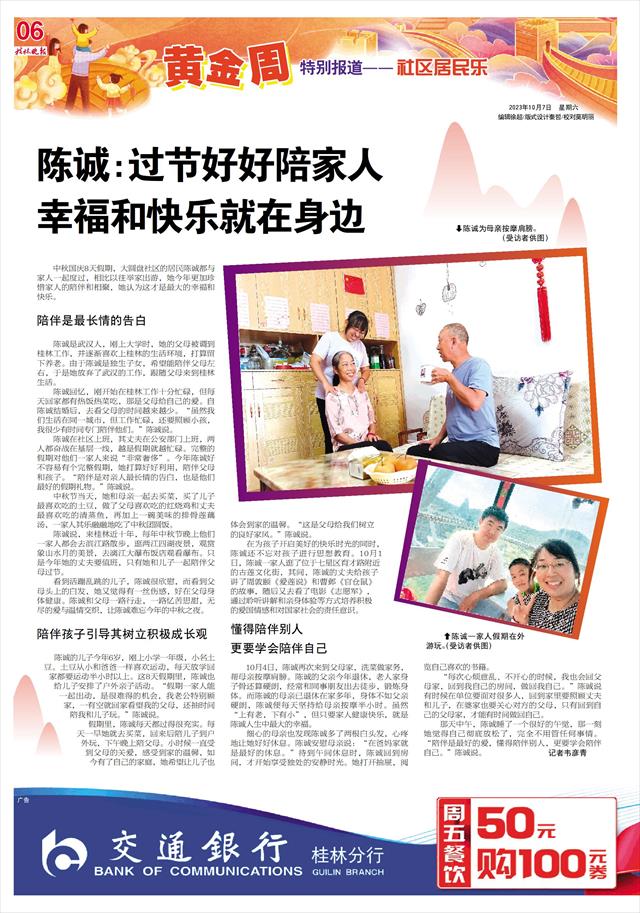 幸福和快乐就在身边   中秋国庆8天假期,大圆盘社区的居民陈诚都与家人一起度过,相比以往举家出游,她今年更加珍惜家人的陪伴和相聚,她认为这才是最大的幸福和快乐。