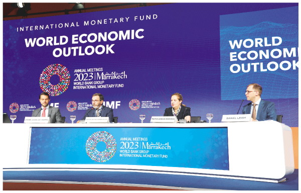 ↑这是10月10日在摩洛哥马拉喀什拍摄的《世界经济展望报告》发布会现场。 新华社发