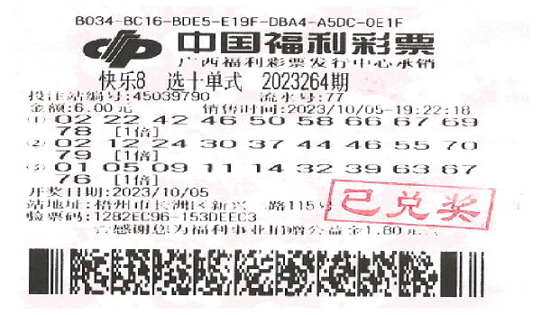 10月5日,“快乐8”游戏第2023264期开奖,当期全国共中出“选十中十”玩法4注,其中广西1注,落户于梧州市,投注方式为自选单式投注,单注奖金500万元。