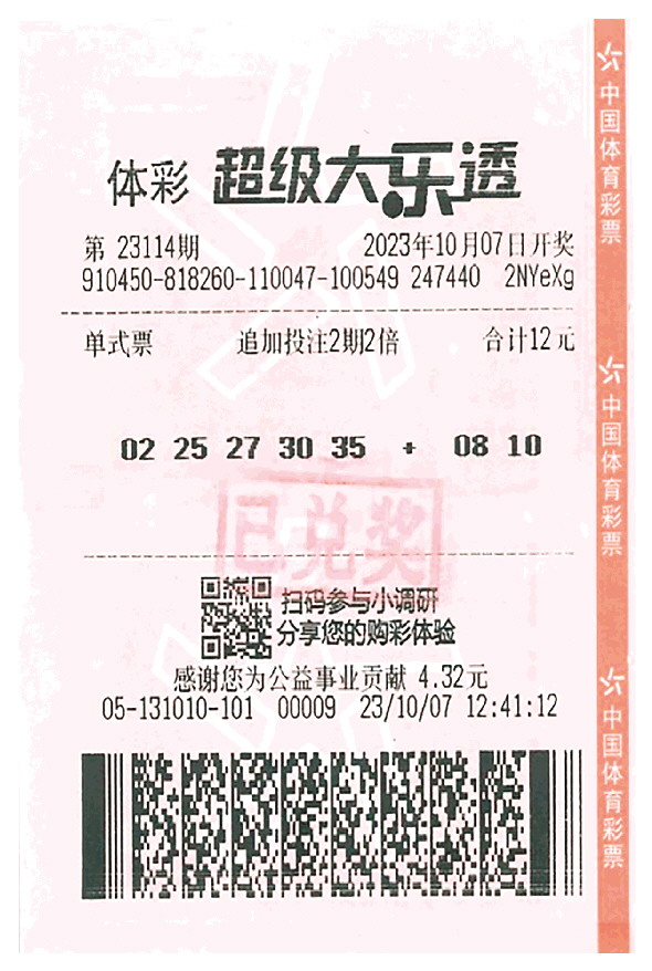 10月7日,体彩超级大乐透第23114期前区开出号码“02、25、27、30、35”,后区开出号码“01、10”。广西玉林购彩者在本期开奖中收获2注追加二等奖,奖金合计122万元。