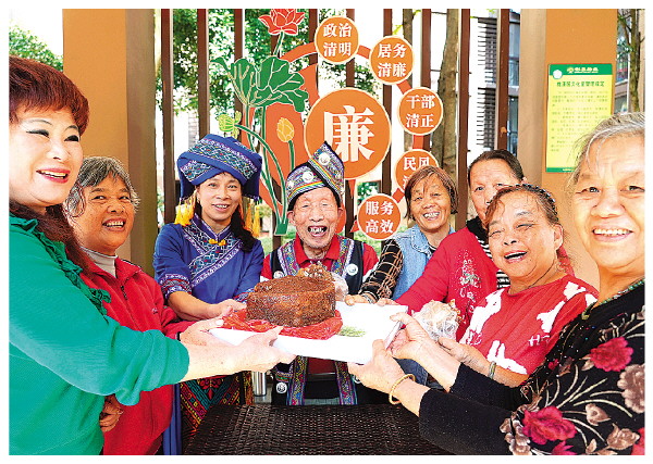 23日,秀峰区桃花江社区90多岁的“山歌王”秦国明与社区的老年人一起吃松糕,欢度重阳节。