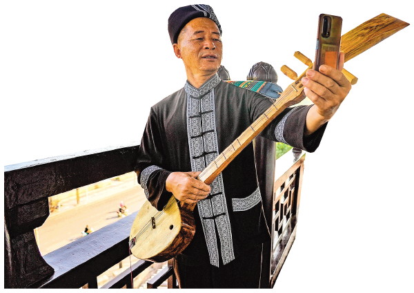 昨天,来自龙胜平等镇的村民吴成干登上逍遥楼,情不自禁地拿出侗族琵琶,歌唱美好新生活。