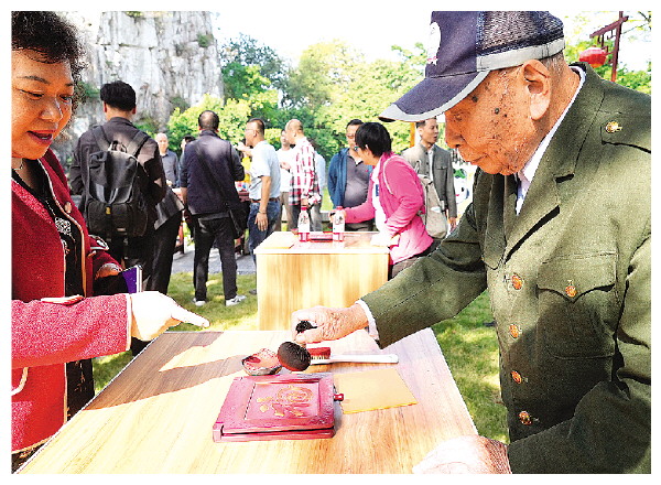 重阳节有登高、祭祖的习俗。当日上午,南朝刘宋时期文学家颜延之的后人来到独秀峰下的颜延之塑像前,缅怀这位为桂林发展作出贡献的历史文化名人。颜延之的后人和游客还登上独秀峰饱览桂林山水美景。在王城内,很多老年朋友还现场体验了“非遗”拓印,亲手拓出“福”、“寿”,为美好生活祈福。