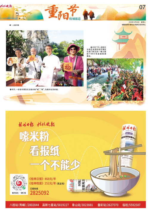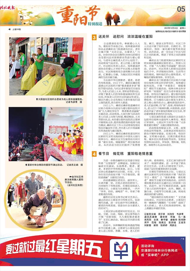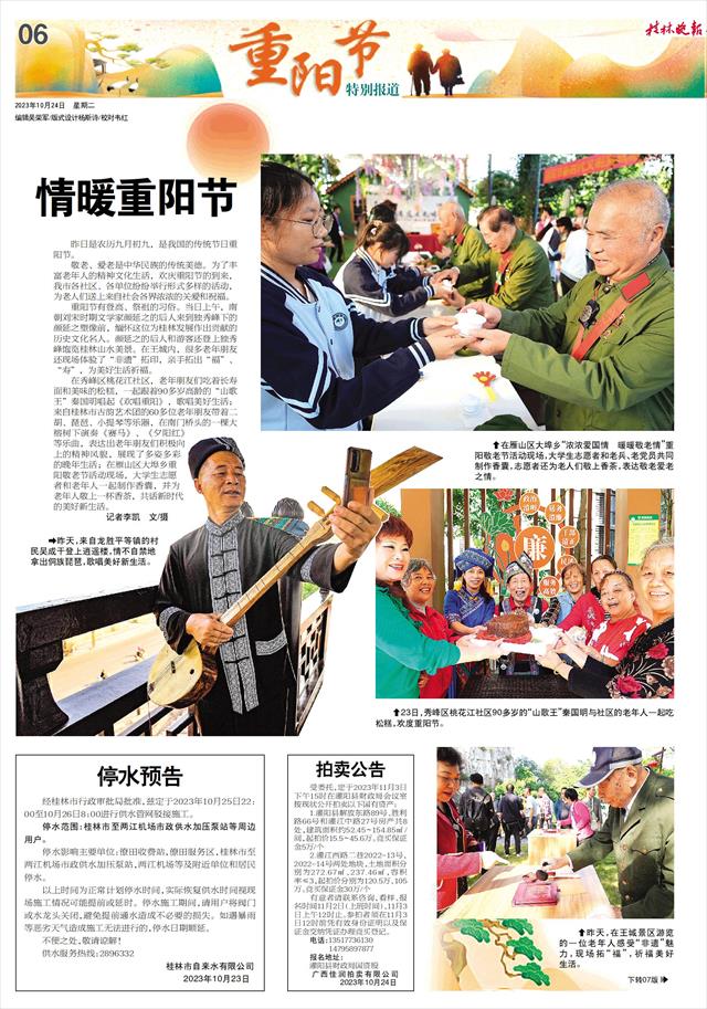 在秀峰区桃花江社区,老年朋友们吃着长寿面和美味的松糕,一起跟着90多岁高龄的“山歌王”秦国明唱起《欢唱重阳》,歌唱美好生活;来自桂林市古韵艺术团的60多位老年朋友带着二胡、琵琶、小提琴等乐器,在南门桥头的一棵大榕树下演奏《赛马》、《夕阳红》等乐曲,表达出老年朋友们积极向上的精神风貌,展现了多姿多彩的晚年生活;在雁山区大埠乡重阳敬老节活动现场,大学生志愿者和老年人一起制作香囊,并为老年人敬上一杯香茶,共话新时代的美好新生活。