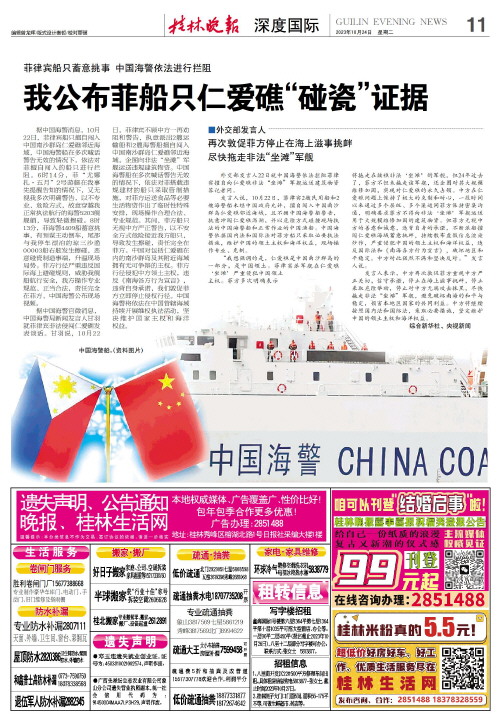 发言人表示,中方再次敦促菲方重视中方严正关切,信守承诺,停止在海上滋事挑衅,停止采取危险举动,停止对中方无端攻击抹黑,尽快拖走非法“坐滩”军舰,避免破坏南海的和平与稳定,损害本地区国家的共同利益。中方将继续按照国内法和国际法,采取必要措施,坚定维护中国的领土主权和海洋权益。