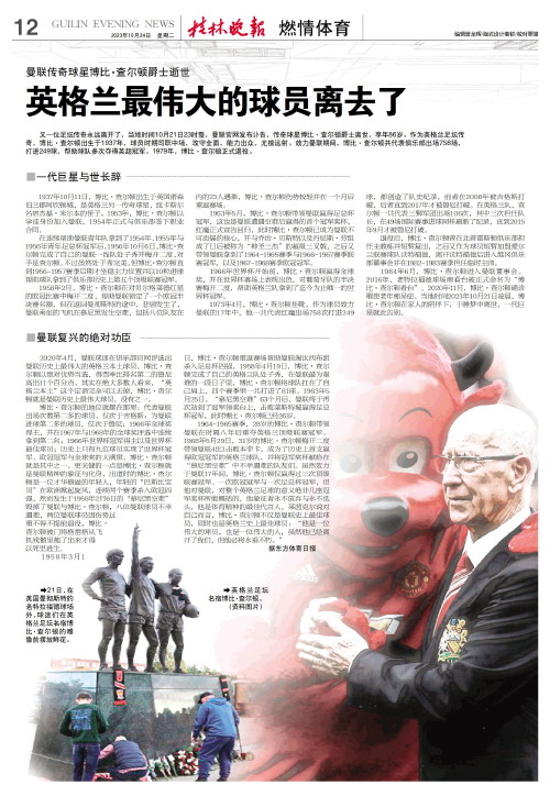 曼联传奇球星博比·查尔顿爵士逝世 英格兰最伟大的球员离去了   又一位足坛传奇永远离开了,当地时间10月21日23时整,曼联官网发布讣告,传奇球星博比·查尔顿爵士离世,享年86岁。作为英格兰足坛传奇,博比·查尔顿出生于1937年,球员时期司职中场,攻守全面,能力出众,尤擅远射。效力曼联期间,博比·查尔顿共代表俱乐部出场758场,打进249球,帮助球队多次夺得英超冠军。1979年,博比·查尔顿正式退役。
