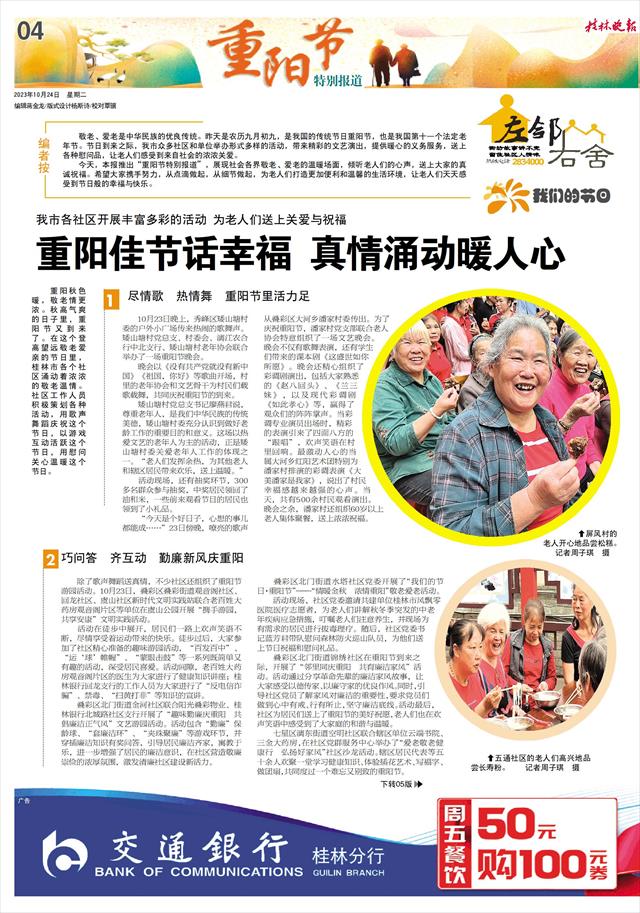 今天,本报推出“重阳节特别报道”,展现社会各界敬老、爱老的温暖场面,倾听老人们的心声,送上大家的真诚祝福。希望大家携手努力,从点滴做起,从细节做起,为老人们打造更加便利和温馨的生活环境,让老人们天天感受到节日般的幸福与快乐。