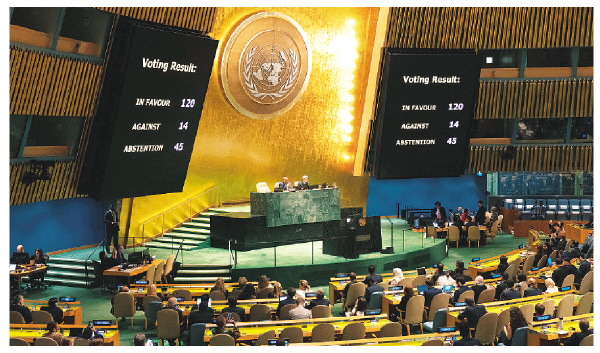 此外,第十届联合国大会紧急特别会议27日就巴以相关决议草案进行投票,最终以120票赞成、14票反对、45票弃权,同意票达到三分之二的多数票获得通过。美国、以色列等投票反对。