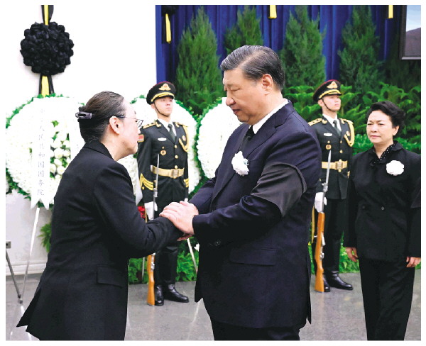 上午9时许,习近平和夫人彭丽媛,李强、赵乐际、王沪宁、蔡奇、丁薛祥、李希、韩正等,在哀乐声中缓步来到李克强同志的遗体前肃立默哀,向李克强同志的遗体三鞠躬,并与李克强同志亲属一一握手,表示慰问。胡锦涛送花圈,对李克强同志逝世表示哀悼。
