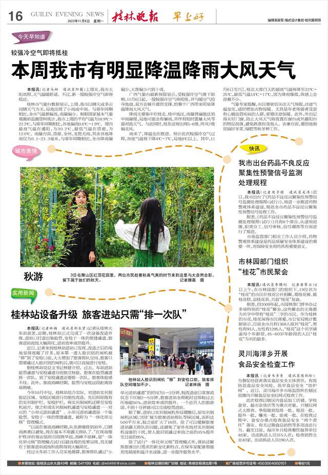 雨来了,降温也在推进。预计此次较强冷空气过程,各地气温将下降4℃~7℃,局地8℃以上。其中,11月6日至7日,桂北大部白天的最高气温将降至22℃~25℃,最低气温14℃~17℃,因为降雨缘故,体感上会凉爽不少。